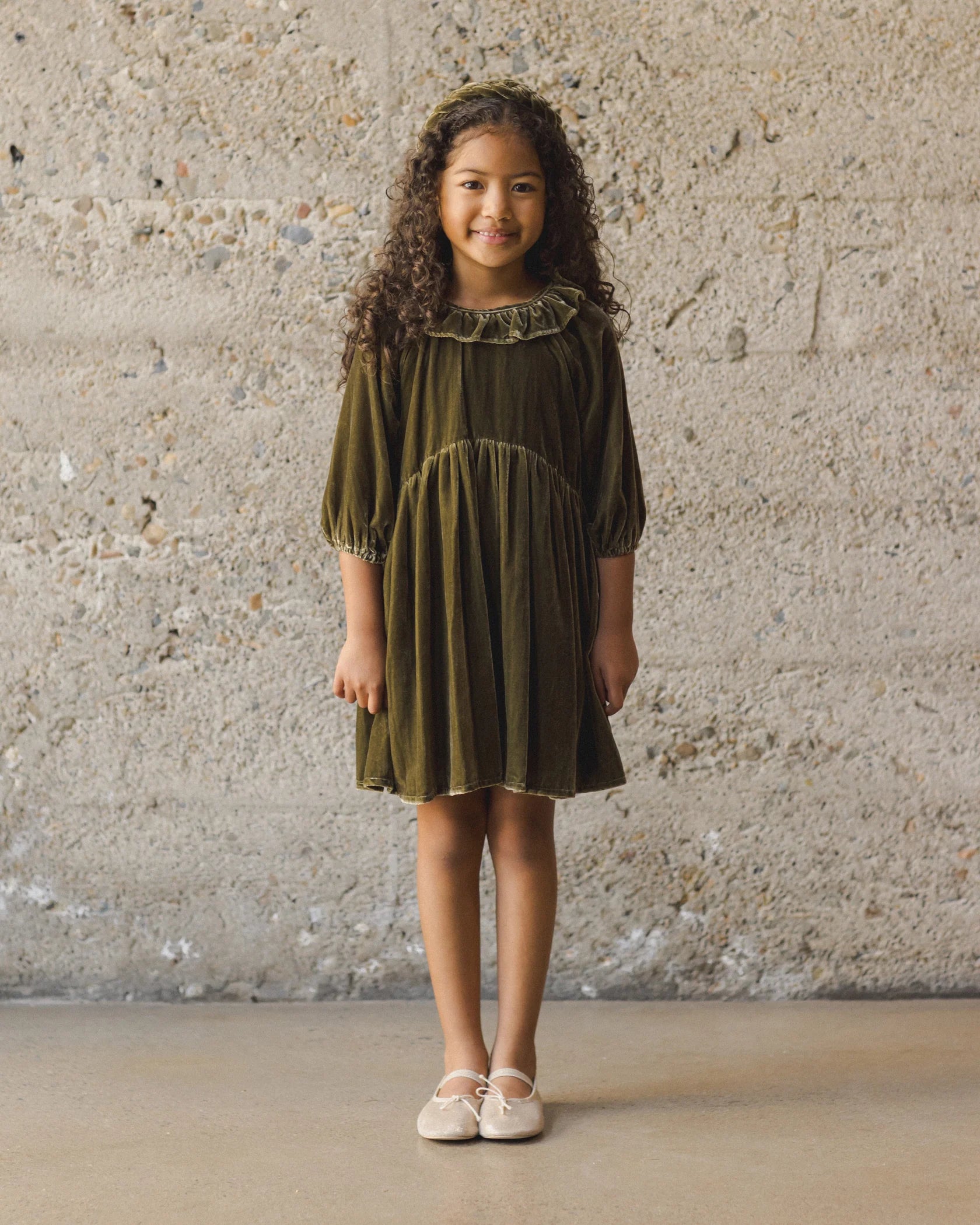 This sophisticated dress has a playful ruffle collar and balloon sleeves. Zipper back closure.