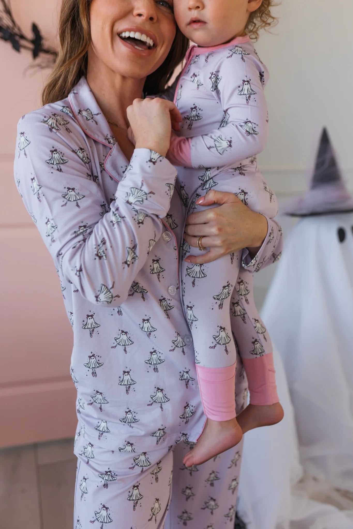 Meet the softest spooky-season ballerina your little one will ever wear. Our Ballerina Ghost print features twirling ghost dancers with pink bows, ballet shoes, and just the right sprinkle of Halloween sparkle. Set against a lavender background, this limited-edition design is available in zipper rompers, two-piece sets, and a women’s pajama set for a charming Mommy + Me match.