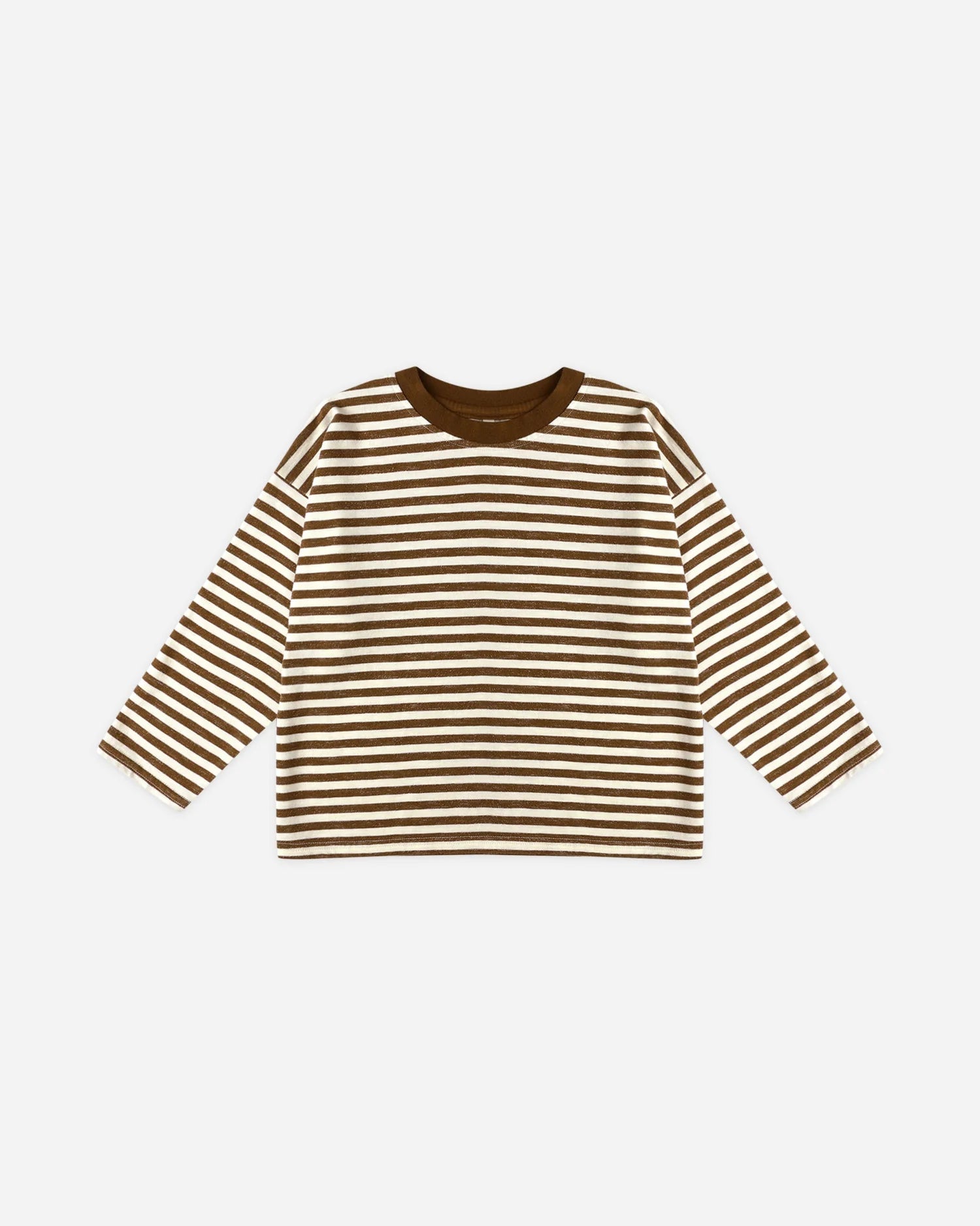 Our boxy-fit Camden Long Sleeve Tee is a seasonal staple, featuring contrast neck ribbing for a cool, classic look. Shoulder snaps included on sizes 0-3M - 18-24M for easy changes.