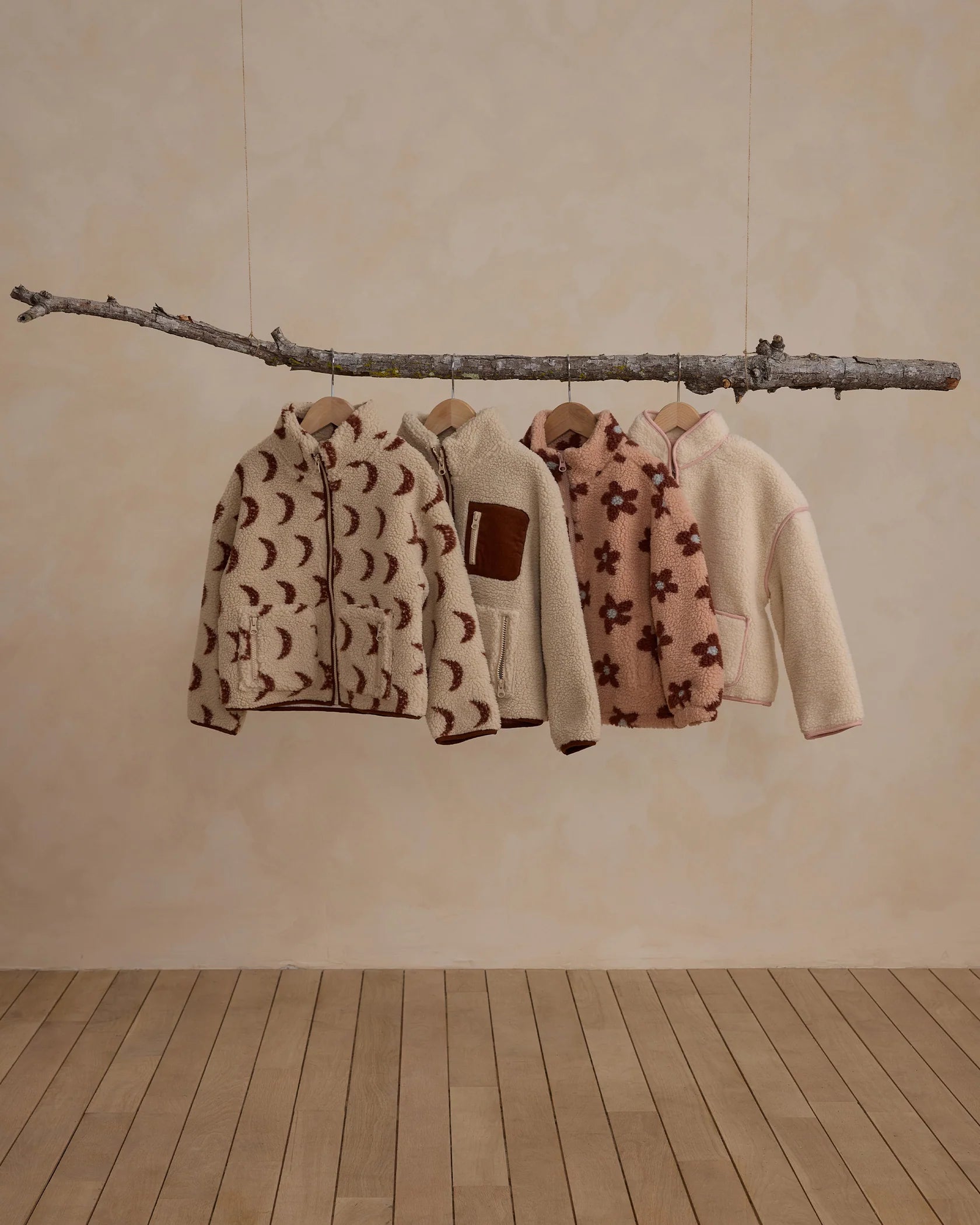 This adorable shearling jacket features two side pockets, zipper closure, and adds a fun pattern and pops of color to any outfit you pair this with.