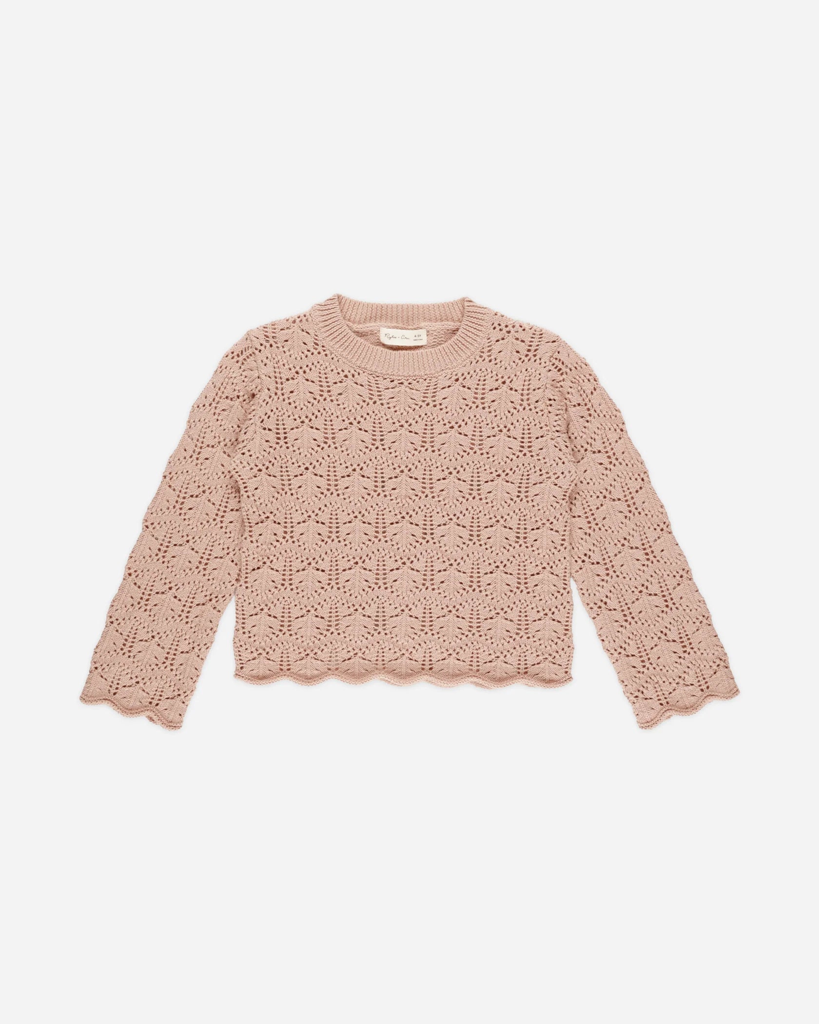 Our beautiful Crochet Knit Pullover has a ribbed neckline, a scallop knit hem and scallop sleeves. A stylish look, paired perfectly with our Crochet Knit Pants.