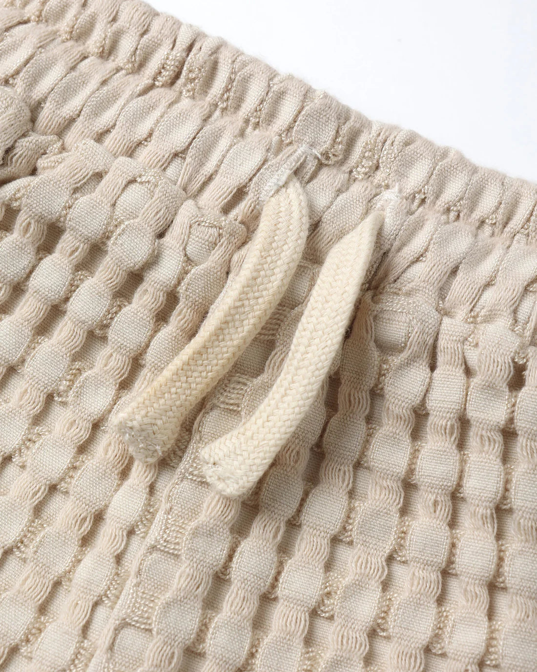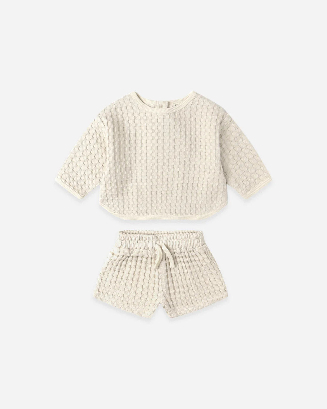 Our Flynn Set is made from our chunky waffle knit and features a boxy long sleeve top with coconut buttons at the back neck, plus matching pull-on shorts for all-day comfort.
