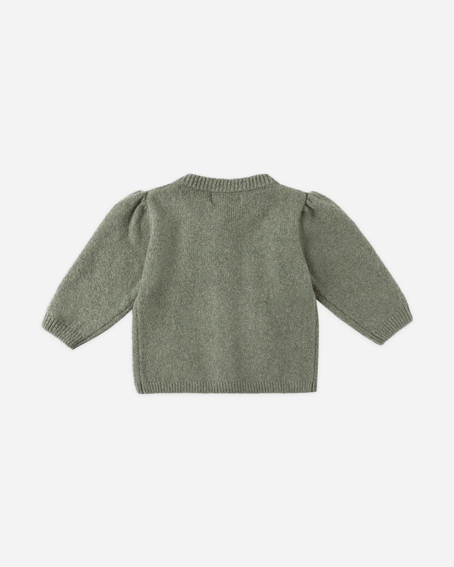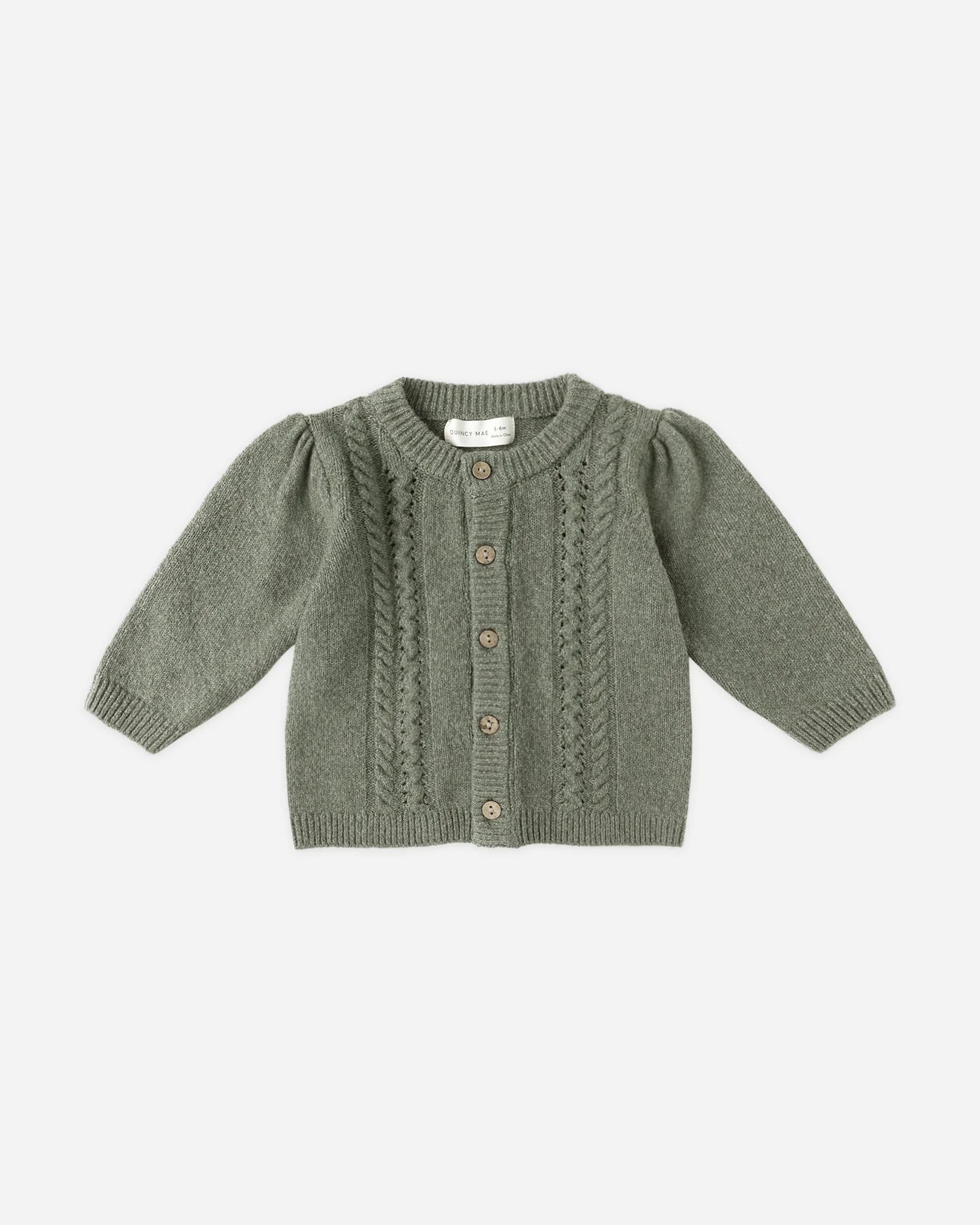 This darling cardigan showcases a beautiful cross cable knit design and buttons down the front for an extra sweet look.