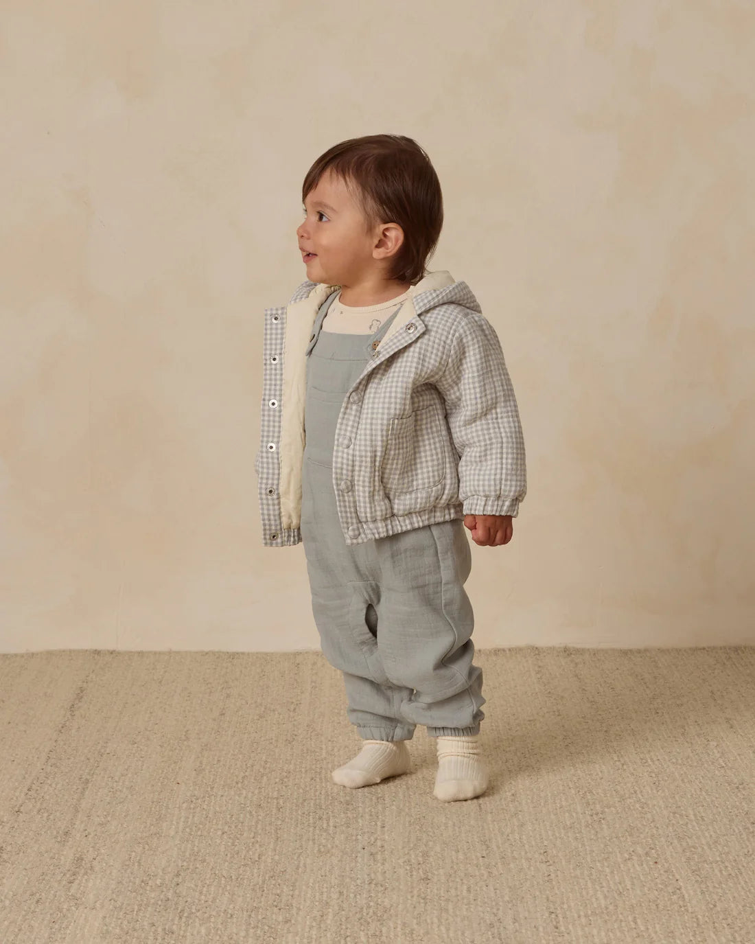 Our Hooded Woven Jacket features front patch pockets, fabric covered snaps, elastic at the sleeves and waist for a snug fit, and a cozy hood for the cooler days ahead.