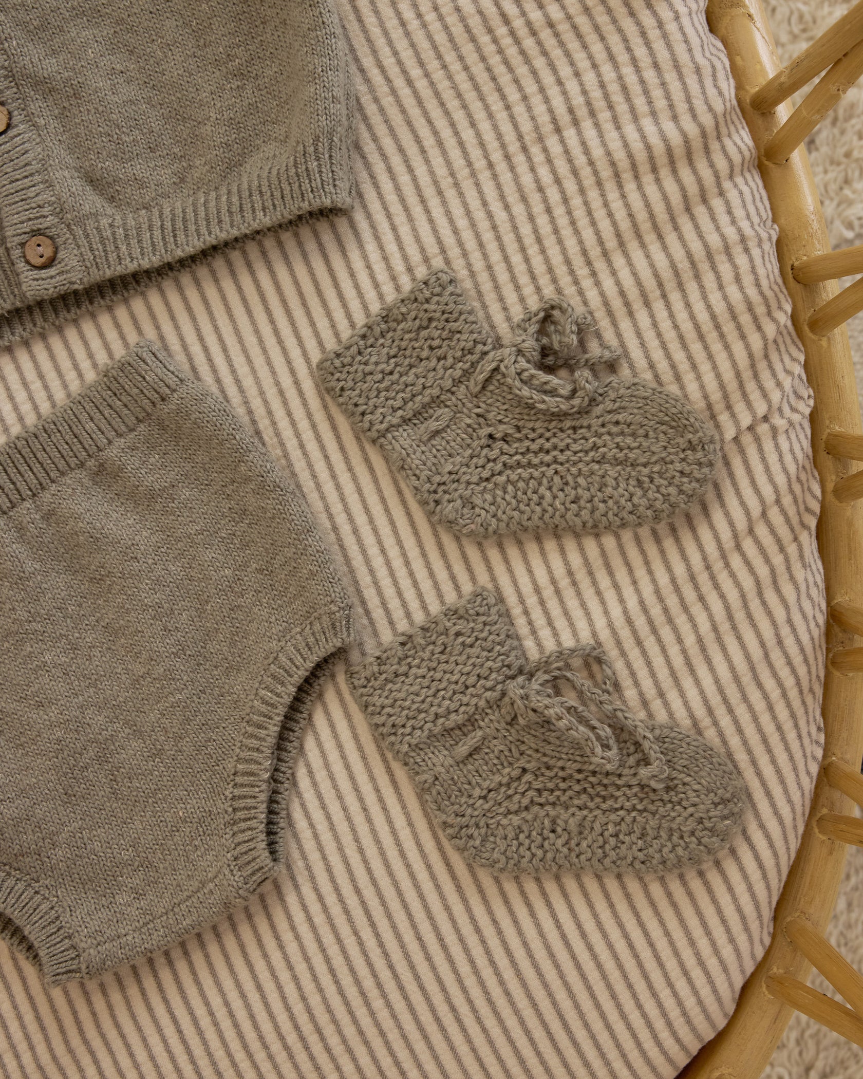 Adorable sweater knit booties with ties at the ankle for a secure fit.