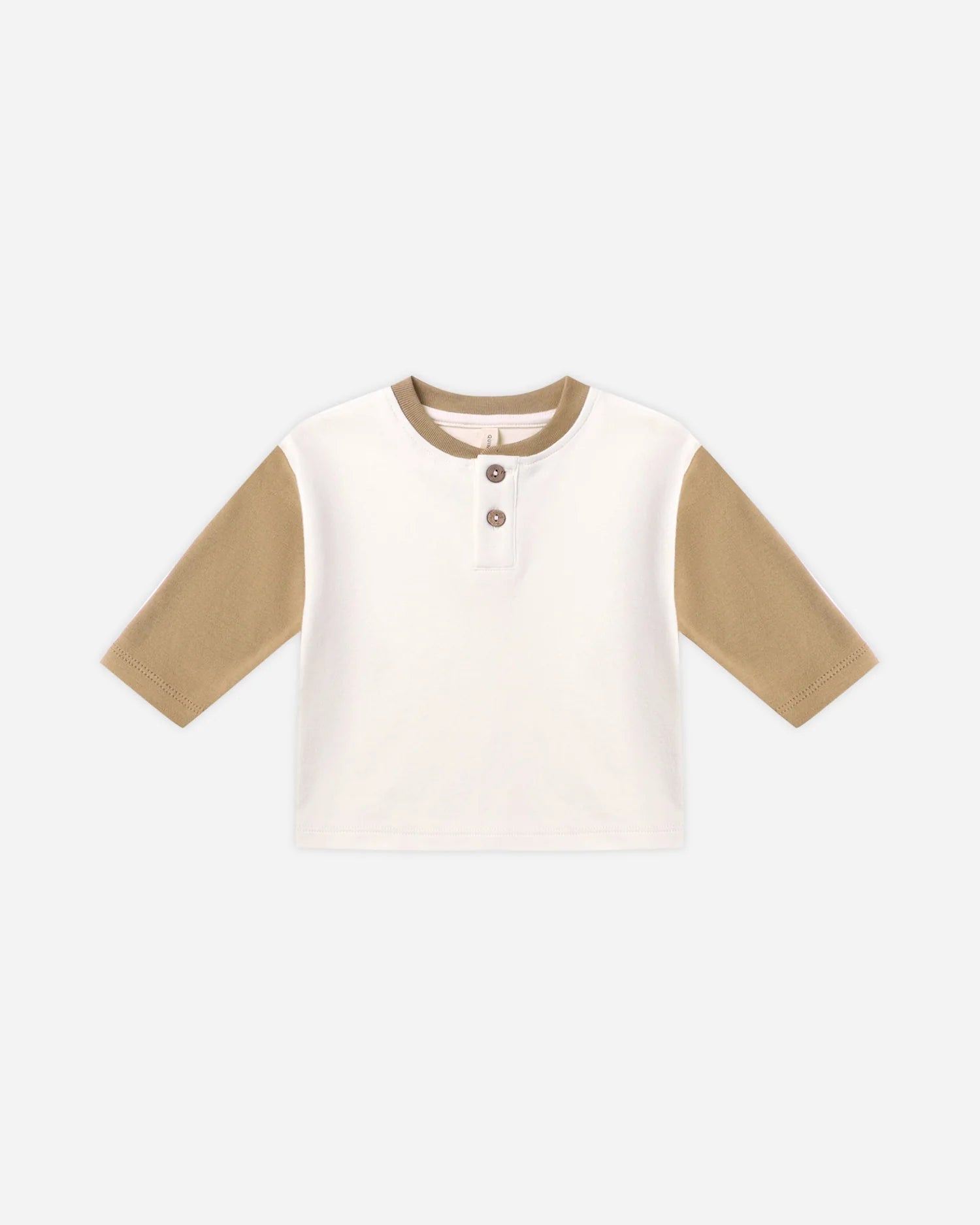A cozy long sleeve tee with a relaxed fit, featuring contrast sleeves, neckline, and front placket, with soft coconut buttons for easy changes.