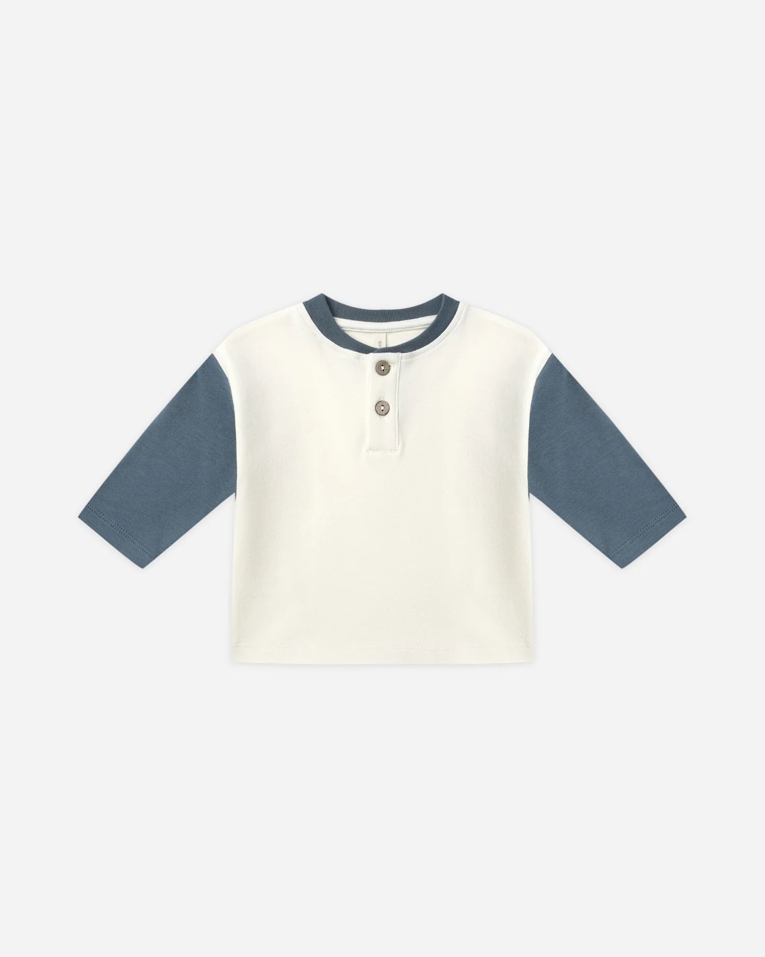 cozy long sleeve tee with a relaxed fit, featuring contrast sleeves, neckline, and front placket, with soft coconut buttons for easy changes.
