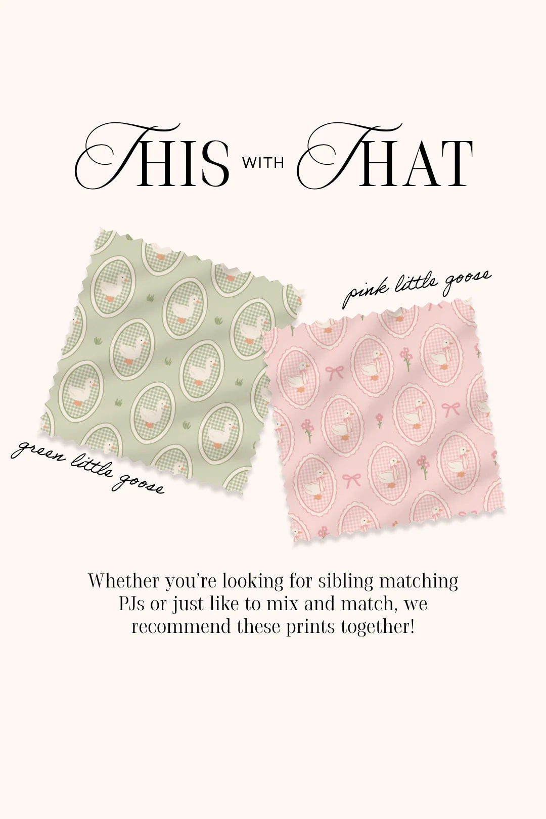Pink Little Goose is a darling twist on a spring classic. Featuring sweet little geese framed in scalloped gingham cameos, tiny florals, and delicate bows, this print feels vintage inspired, feminine, and perfectly made for Easter celebrations.