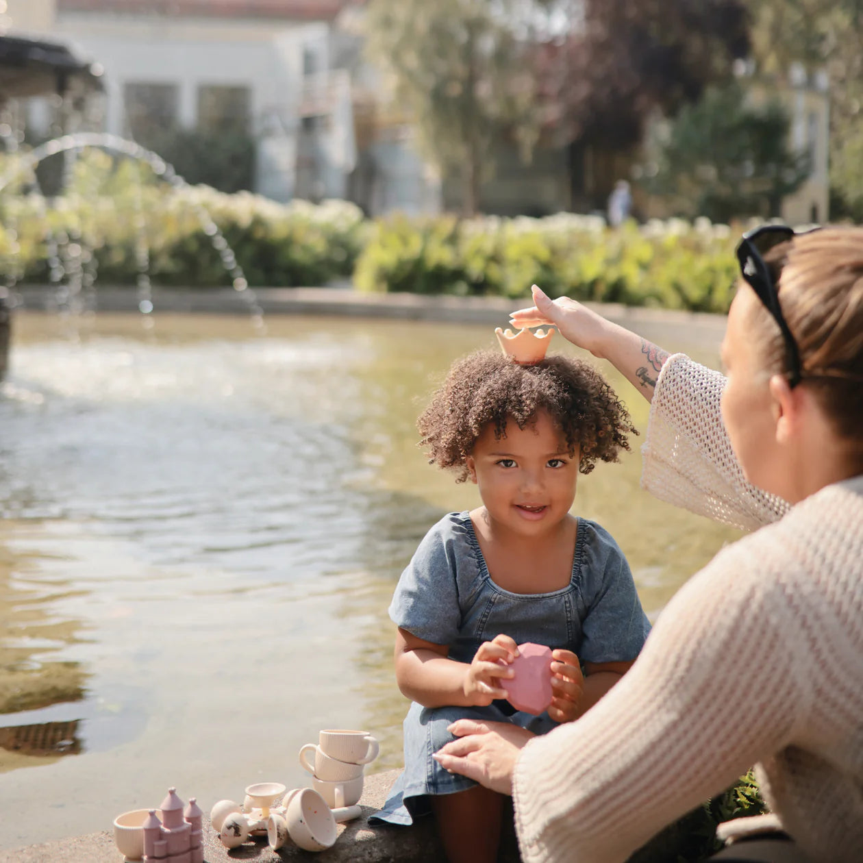 Make a splash at bathtime with the princess bath play set that includes a crown, castle, heart gem and bear princess. Made from 100% food grade silicone, the soft material is easy for little hands to hold while wet or dry. Its inventive design allows each toy to open into two separate pieces for thorough cleaning and fast drying. This feature allows the toys to remain mold-free with its easy-to-clean pieces that are dishwasher safe. After each use, we recommend opening the pieces to rinse out and air dry before storing.