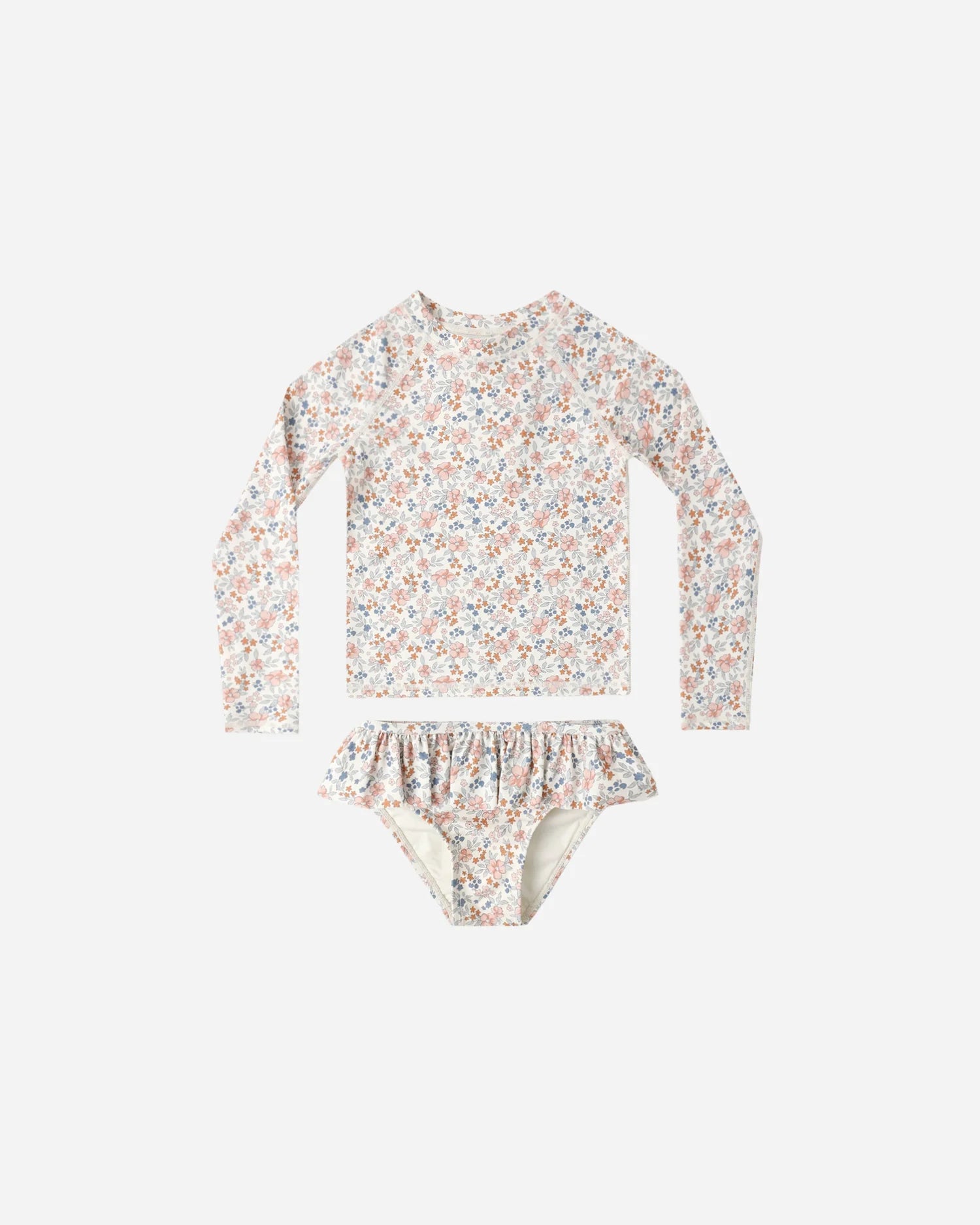 This two-piece rashguard set will have your little one protected from the sun in style. Featuring a long sleeve rashguard top and coordinating ruffle skirted bikini bottom.