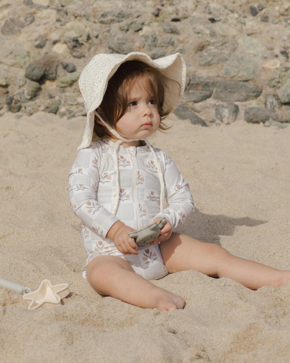 This one-piece rashguard swimsuit will have your little one protected from the sun in style. Featuring a zipper front closure and ruffle detail at the leg openings.