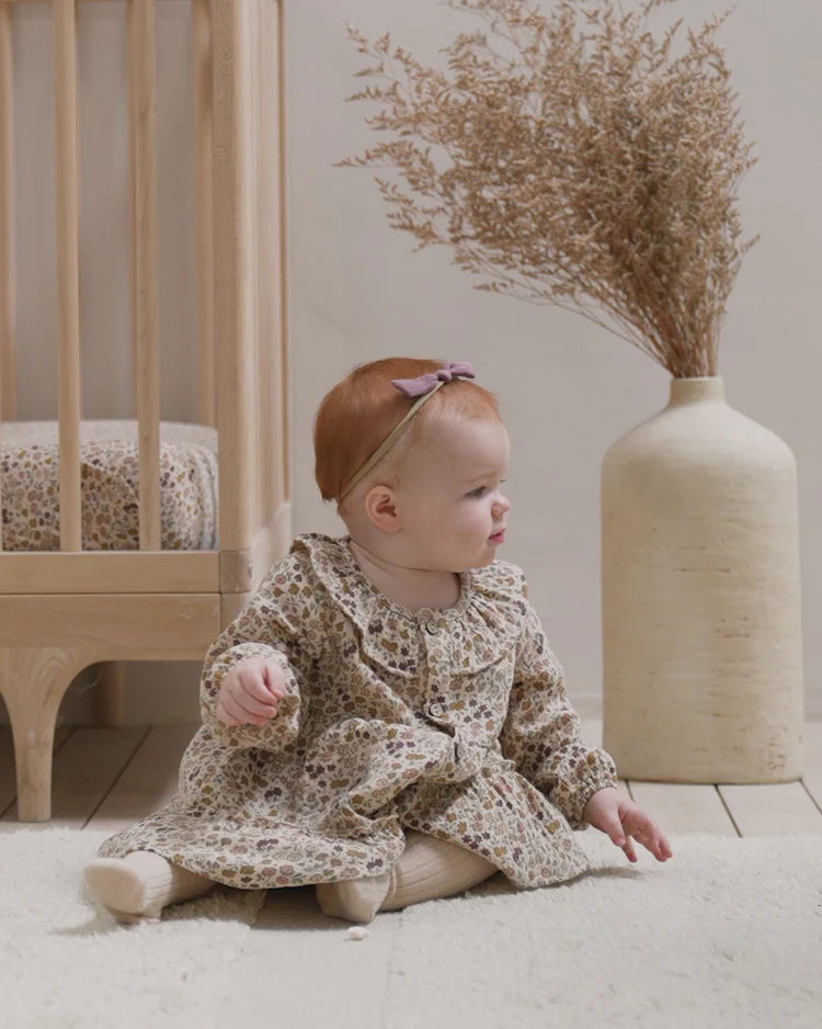 Soft baby dress with tiers, long sleeves, and cute ruffled collar along the neck. It snap buttons along the center front for easy changing as well also. All sizes includes our gathered bloomers!