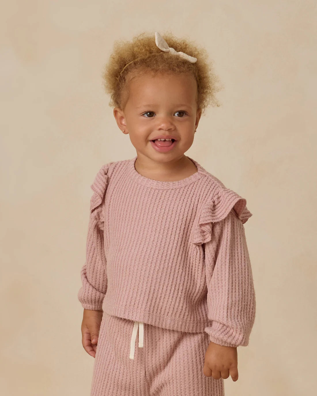 Made for cozy days, this darling set in our fuzzy waffle knit includes a long sleeve top with ruffle shoulder detail and wide leg pants featuring an elastic waistband and fixed cotton drawstring.