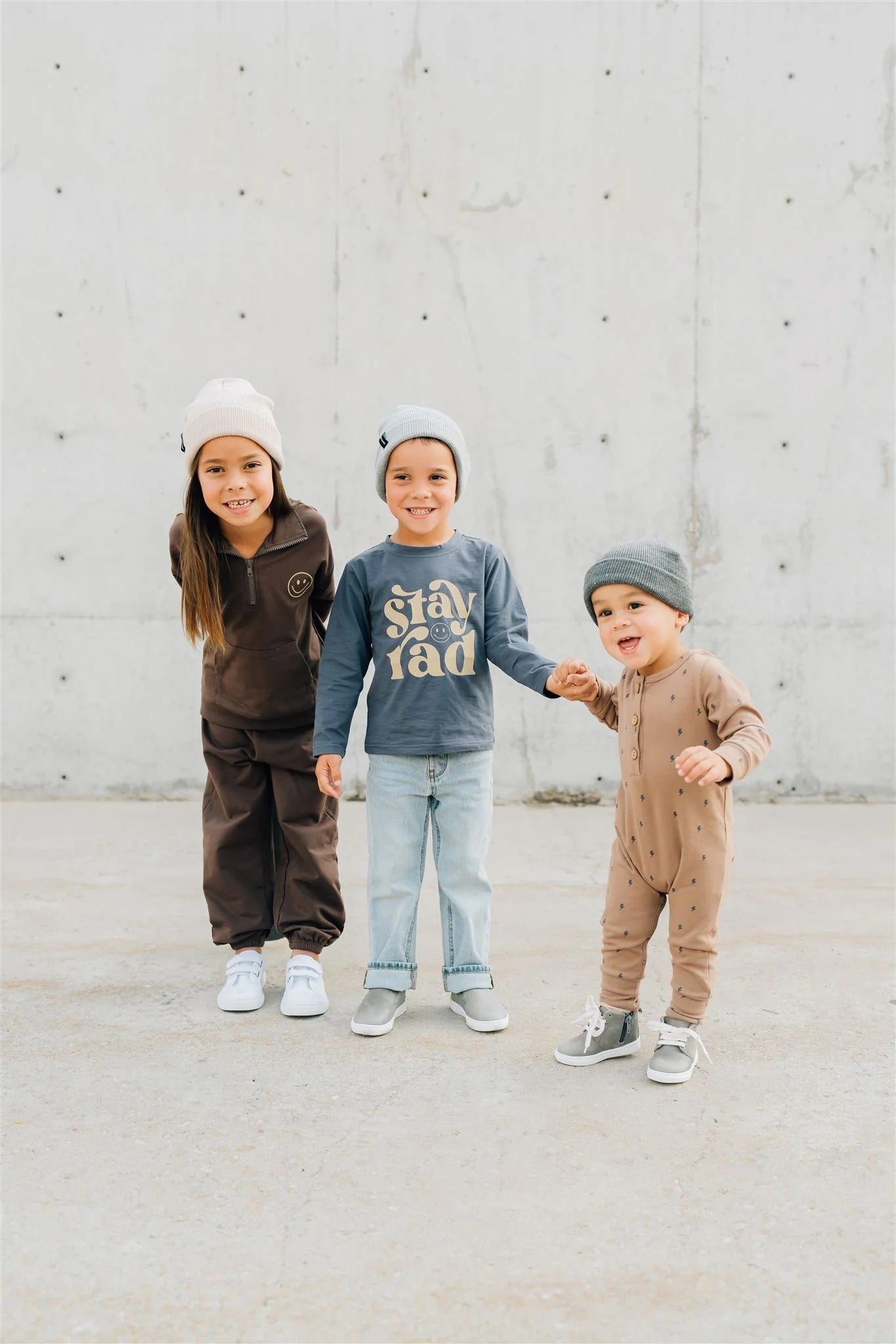 Ideal for everyday adventures, our Stay Rad Long Sleeve Cotton Tee is both stylish and practical. Pair it with our leggings for a complete look that keeps your child comfy and trendy. Shop now and add a rad touch to your little one's wardrobe!
