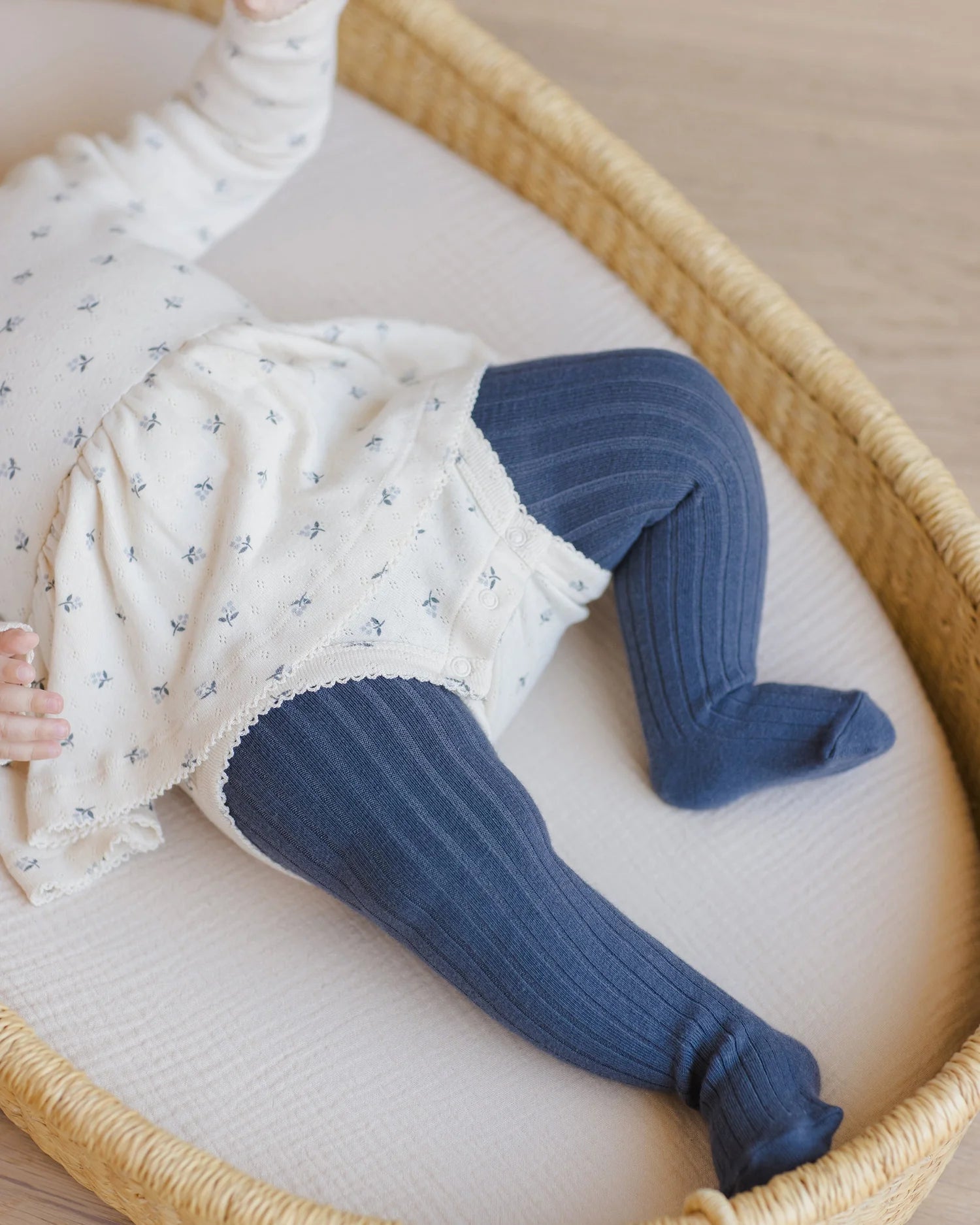 Rib knit footed tights made from soft, stretchy fabric to keep little ones warm. Layer under one of our dresses for an extra sweet look.