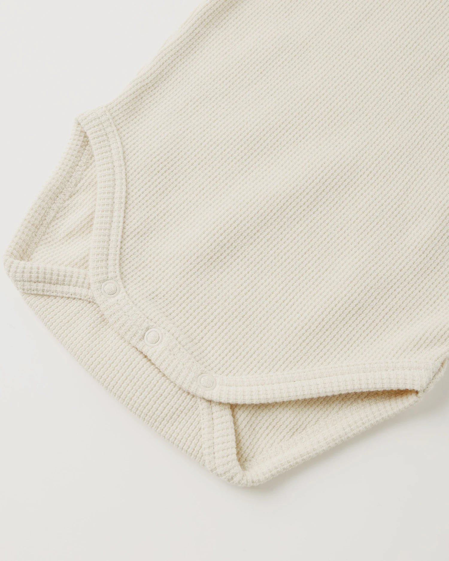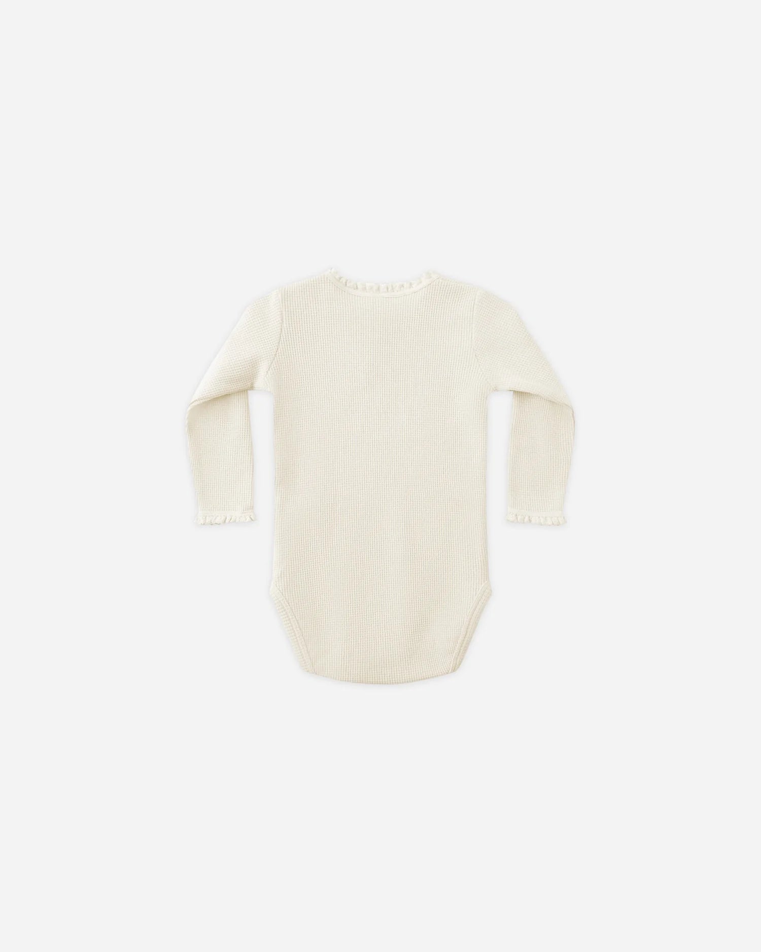 Long sleeve onesie in our lightweight waffle knit, featuring the sweetest crochet lace ruffle detail. Designed with shoulder and bottom snaps for easy changes.