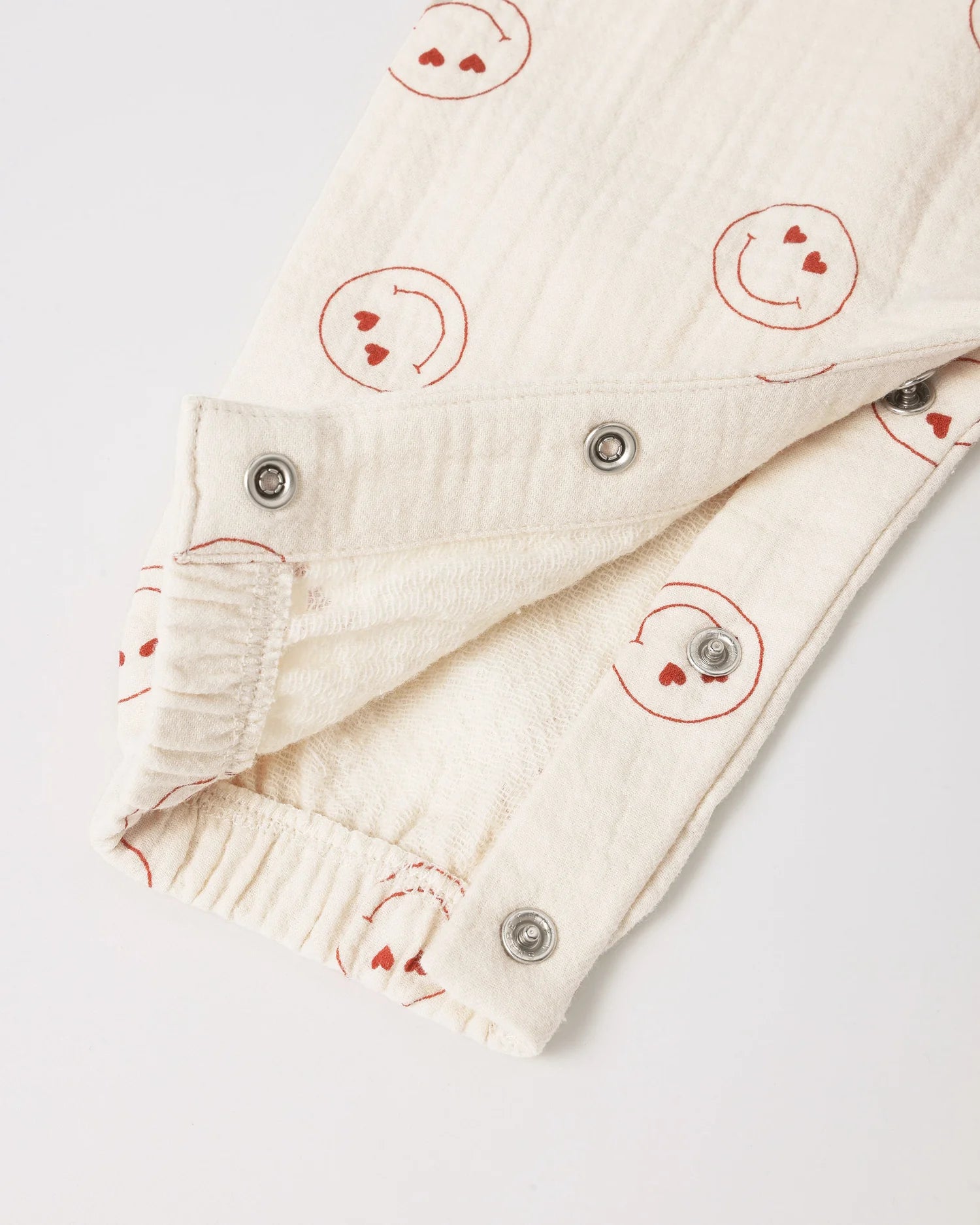 Long sleeve jumpsuit in our lightweight gauze fabric with coconut buttons down the chest, and hidden snaps along the inseam for easy changing. Elastic at the sleeve and leg openings for the perfect fit.