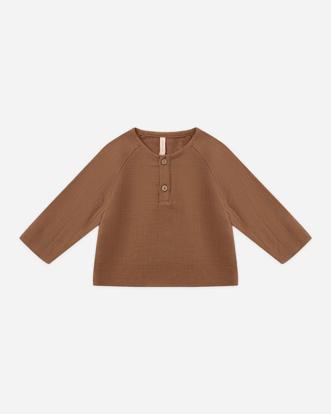 Our Zion Shirt, crafted from soft cotton gauze, features a boxy fit, long sleeves, and a button-front closure for easy wear. Pair with our Woven Pants for a coordinated, dapper look.